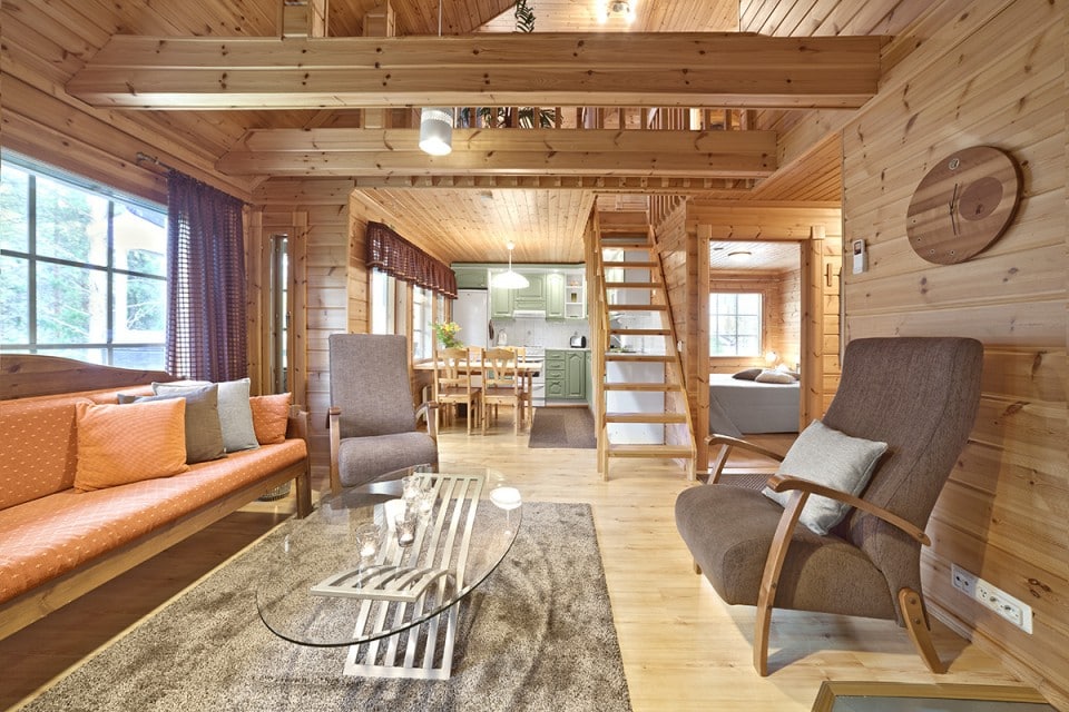 Kolmen makuuhuoneen hirsimökki rauhallisella sijainnilla.